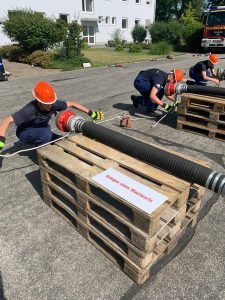 Ihr theoretisches Wissen und praktischen Könnnen haben fünf Jugendliche unserer Feuerwehr im Juli bei der Bayerischen Jugendleistungsprüfung in Zolling unter Beweis gestellt. Unter den strengen Augen der Prüfer galt es etwa in der Praxis, mehrere feuerwehrtechnische Aufgaben zu bewältigen – etwa Kuppeln einer Saugleitung, Anlegen eines Brustbunds, Werfen von Leinenbeuteln und Auslegen einer Schlauchleitung. Im theoretischen Teil mussten einige Fragen beantwortet werden.